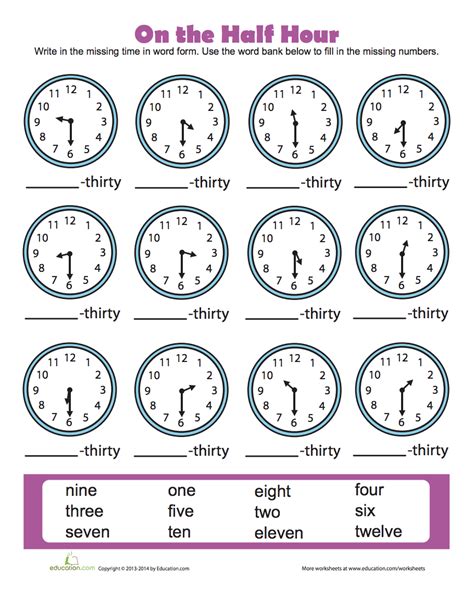 Web time to the half hour primary resources half past differentiated maths activity sheets analogue clocks half past matching game 4.3 (21 reviews) tell and write the time differentiated worksheets 4.8 (34 reviews) year 1 diving into mastery: Worksheet #1 worksheet #2 worksheet #3 worksheet #4 worksheet #5 worksheet #6. It has an answer key attached on the second page.